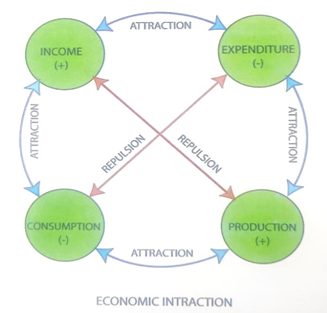 In order to create a shape of economy is limited to a national economy and all the individuals and the groups whether is represented by business enterprises association of people any group, state or corporate entities. shape which has a sphere which is called the sphere of economy (SOE) within this sphere, square is also created to illustrate the interdependence and fluctuations within the geometrical pattern of a square. in state of equilibrium a perfect sphere is created and within the perfect sphere a perfect square is drawn, this is termed as square of stability of economy (SOS). The four poles of a square are represented by four fundamental forces of economic activities, but they represent different economic activities. consumption and production are essentially physical activity because they require a physical commodity that can be produced, consumed and can be traded as well.